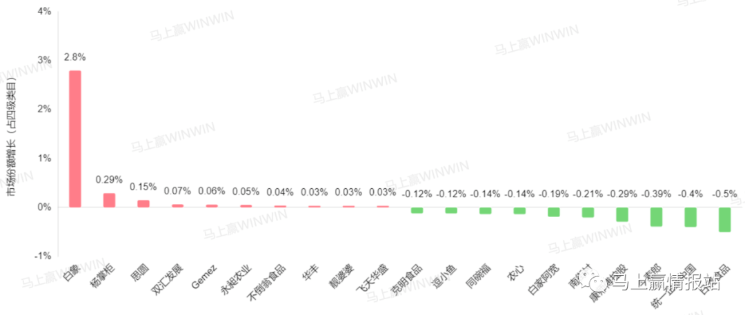 從集團得失的角度來分析市場數據,方便面頭部企業之間的競爭局勢如何便呼之欲出瞭。可以看到,白象2.8%的市場份額增長與增長第二名的楊掌櫃拉開瞭約2.5%的差距。除去頭部品牌的競爭之外,新品牌如楊掌櫃、思圓等目前也均已獲得一定聲量、有所成長。哪怕是在老牌頭部企業的圍追堵截之下,擁有品牌力、產品力的新品牌通過創新SKU突破封鎖、拿下一城的可能性仍有,依然值得市場想象。