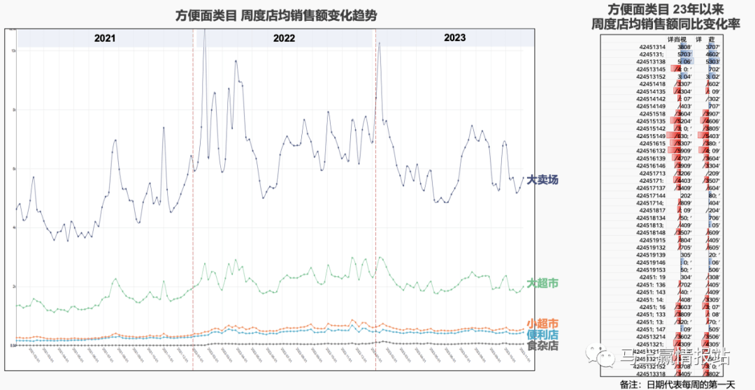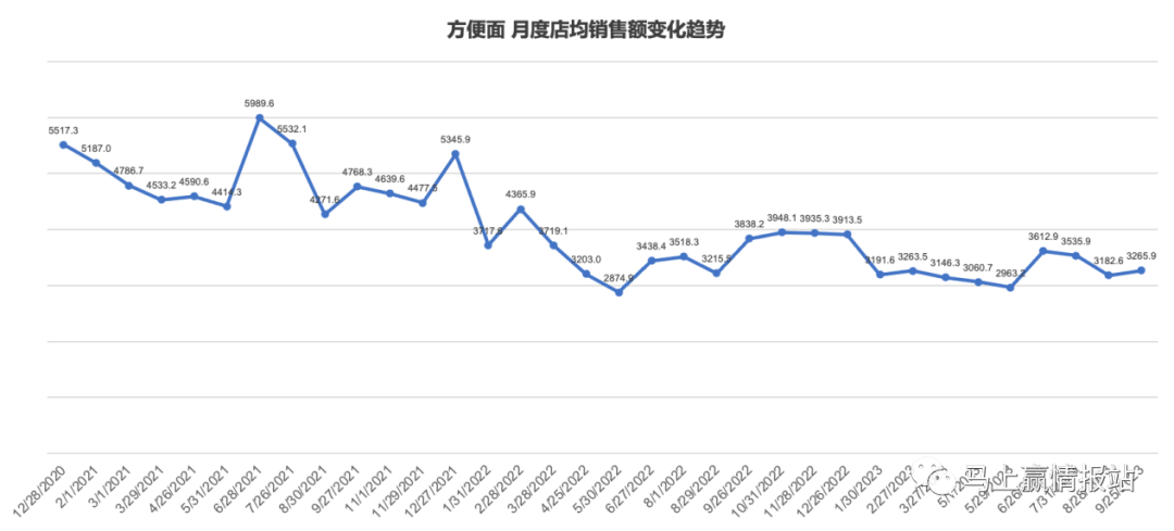 方便面作為高滲透、高鋪貨的品類,業態銷售數據對觀察其市場表現也有十分重要的參考價值。馬上贏基於線下零售數據監測網絡所獲取的數據,從這一角度對方便面市場體量進行瞭分析。總體來看,在長期的維度上,方便面的店均賣力正波動下滑;而從短期的維度來看,2023年方便面在各渠道的店均賣力表現均不及2022年的同期水平,其周度店均銷售額在經歷瞭2022年的上漲之後又逐漸回落。在這一系列的趨勢背後,我們似乎可以看到曾經風光無限、如今影響力猶存的方便面市場正面臨一場硬戰,其體量或將見頂甚至縮窄。