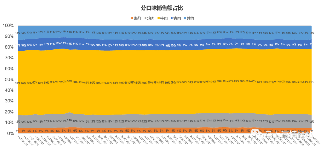 對於競爭激烈、市場體量或將見頂的方便面品類而言,口味是其創新的主戰場。目前頭部或影響力較大的方便速食企業,也往往是通過一次成功的口味研發而築起其市場的護城河,三養的火雞面、康師傅的雙蘿卜牛腩面等爆款無一不是在口味上做足功夫而獲得消費者認可的。數據上來看,目前牛肉作為經典口味目前仍占據瞭約60%的市場,一傢獨大;豬肉口味的銷售額占比近期出現小幅下跌;雞肉、海鮮口味也是方便面市場內的常見主流口味,市場份額相對穩定。值得註意的是,在主流口味之外的更具創新性的口味也不可忽視,其市場份額已經達到瞭10%以上。