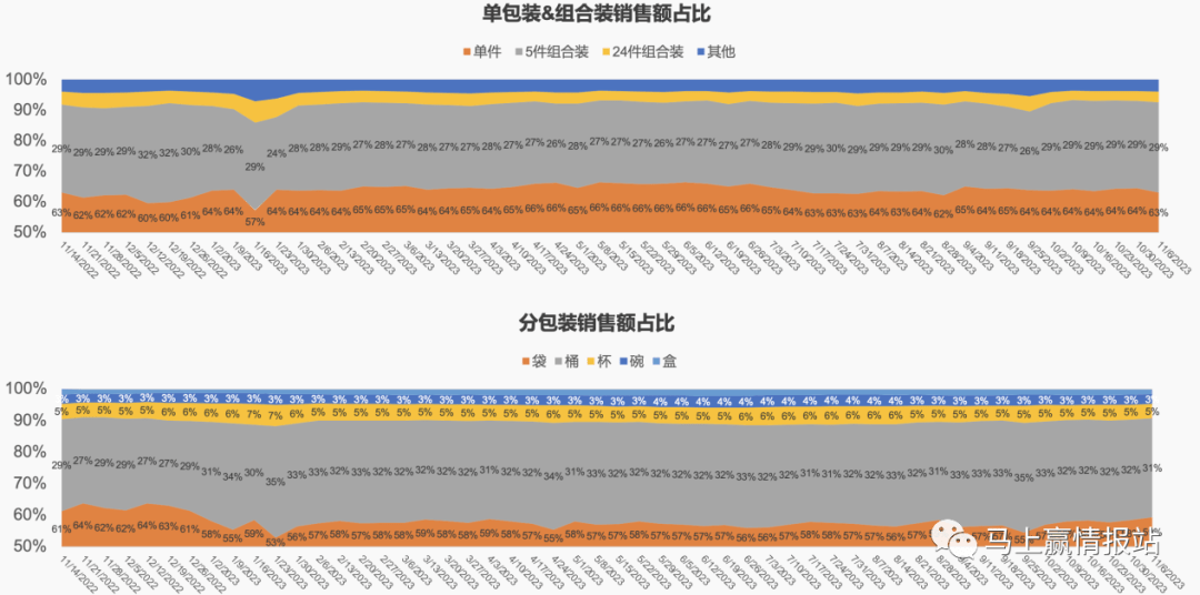 在此基礎上,方便面市場分包裝銷售額占比的數據情況顯示出當前這一市場仍是袋裝、桶裝產品的天下,二者的銷售額占據瞭方便面市場總體份額的九成,隻為杯裝、碗裝、盒裝產品留出瞭一成的生存空間。另一方面,單件、5件組合裝同樣也瓜分瞭約90%的方便面市場,符合方便面即時充饑、便捷快速的產品特征。