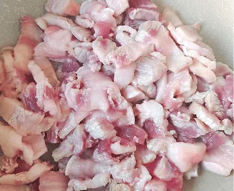 3、熱鍋涼油,下入五花肉煸炒,把水分炒幹。