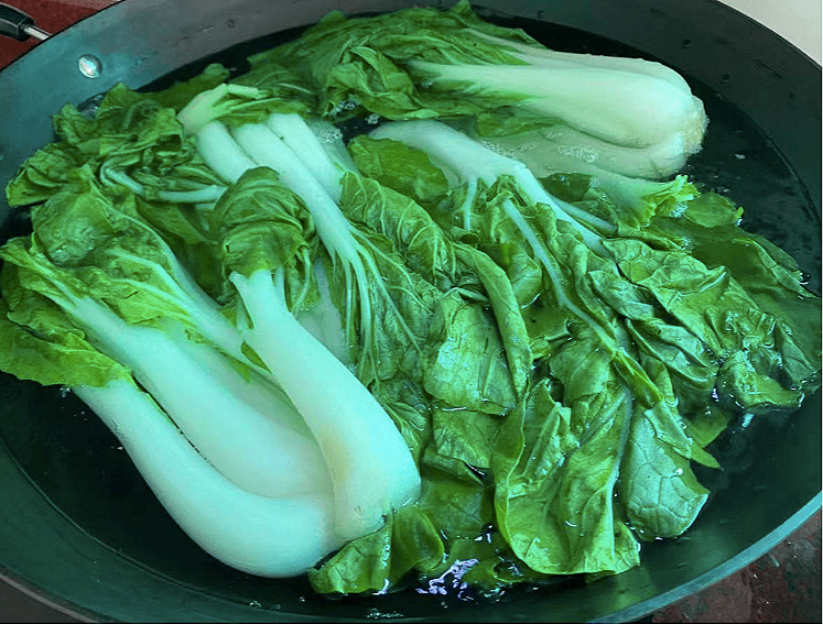 3、鍋裡加水煮沸,加入少許的鹽,下入奶白菜焯水一下,焯水哥10秒鐘即可。