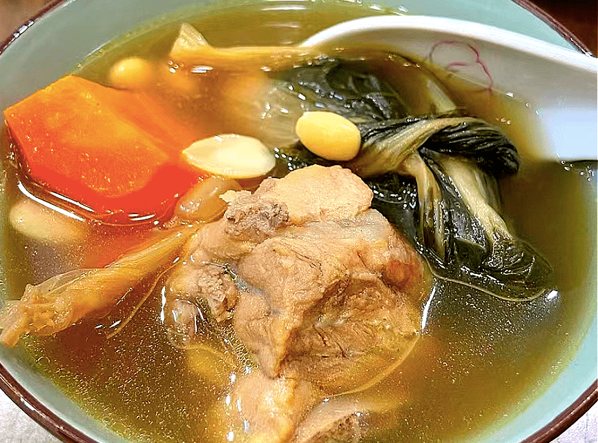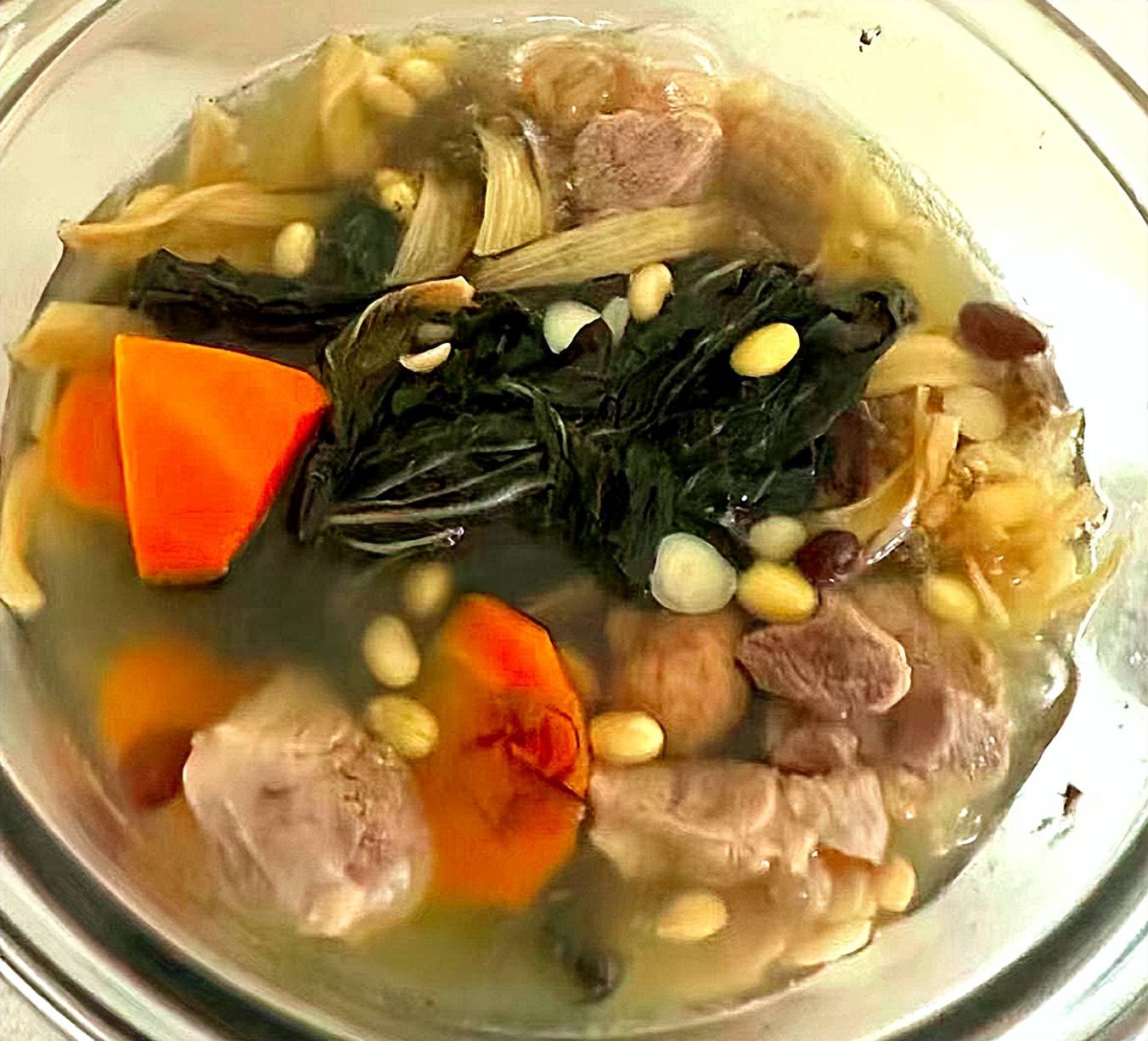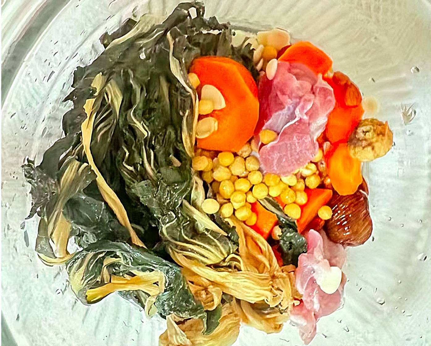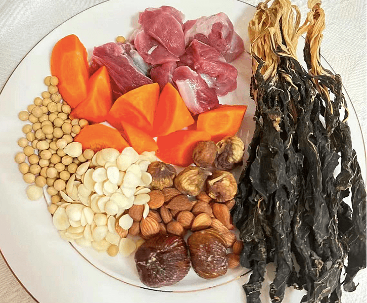1、食材:奶白菜幹、豬骨瘦肉、黃豆、胡蘿卜、蜜棗、杏仁、無花果幹、北杏。