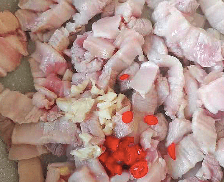 2、五花肉洗凈切片、奶白菜幹泡軟洗凈切段、大蒜辣椒洗凈切好待用。