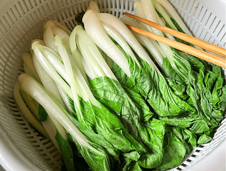 4、焯水好的奶白菜撈起攤開瀝幹水。