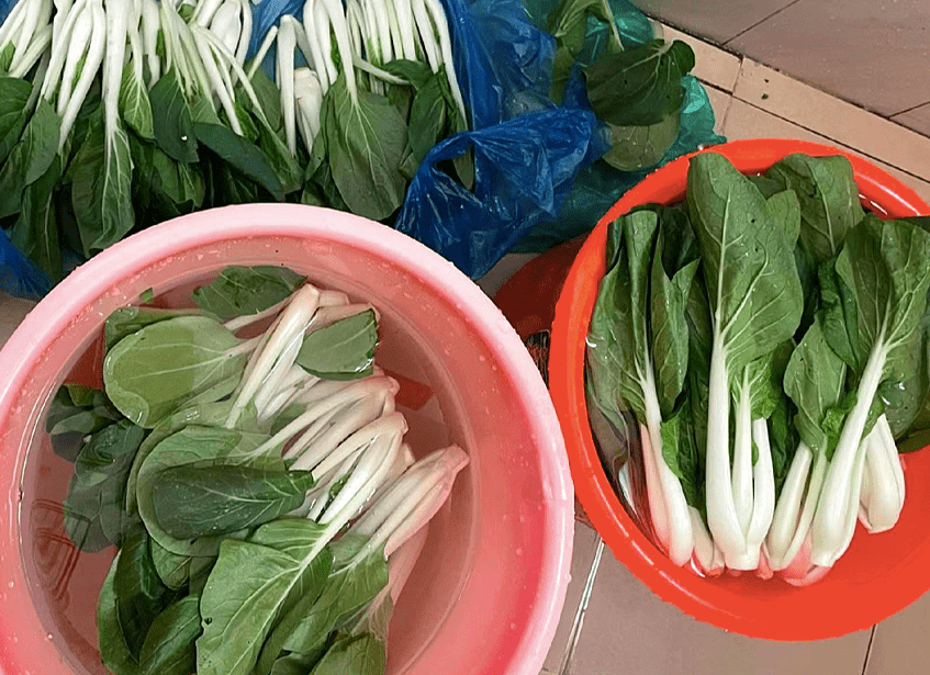 2、奶白菜清洗幹凈,一定要把奶白菜根部的菜梗掰開沖洗,裡面會有積沙子。
