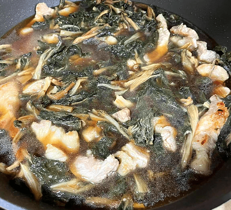 5、加入菜幹一起翻炒均勻,少許的生抽、蠔油、少許的冰糖、少許老抽。