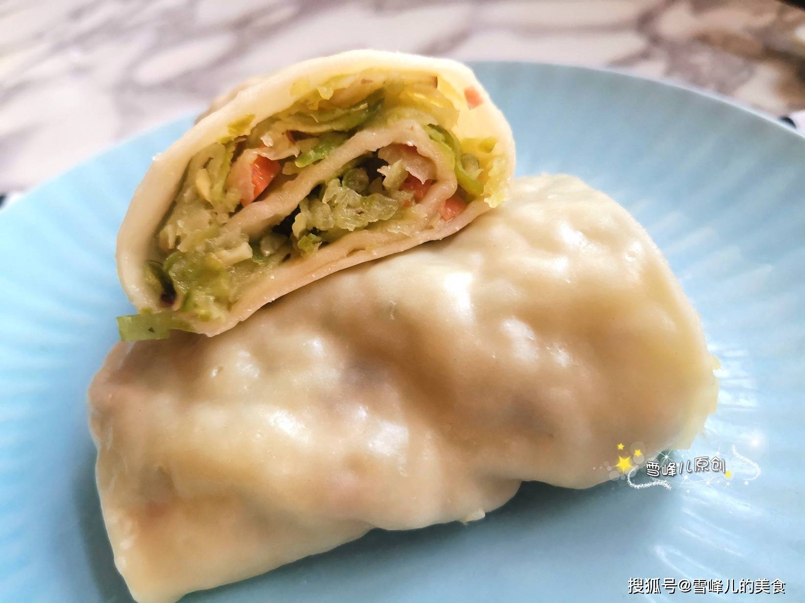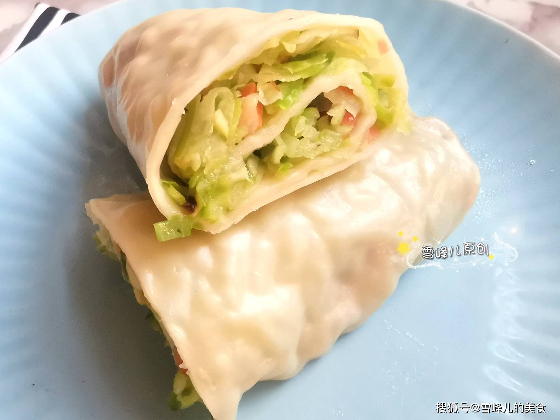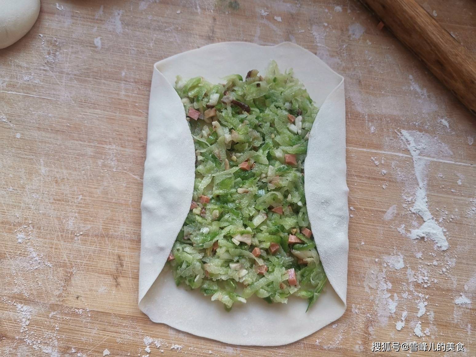 第四步:把面團揪成大小一致的面劑子,揉圓按扁,搟成薄薄的面皮,均勻的把蘿卜餡攤道面皮上,兩邊折起,卷起來即成。