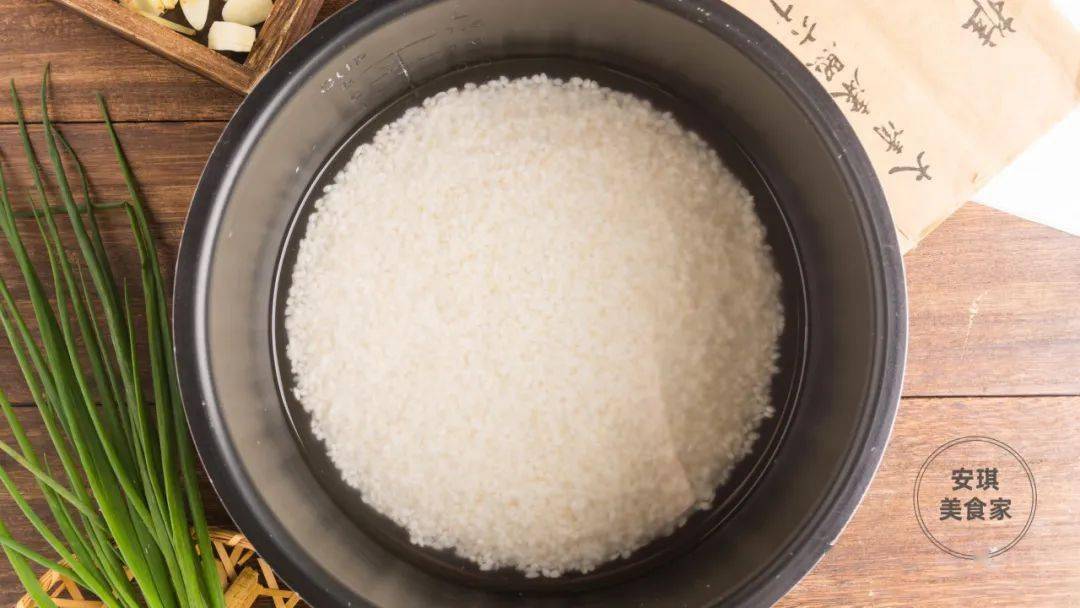 5、泡好的大米倒入電飯煲,將排骨和湯汁一起倒入,湯量和平時用水煮飯時一樣,按下煮飯鍵。