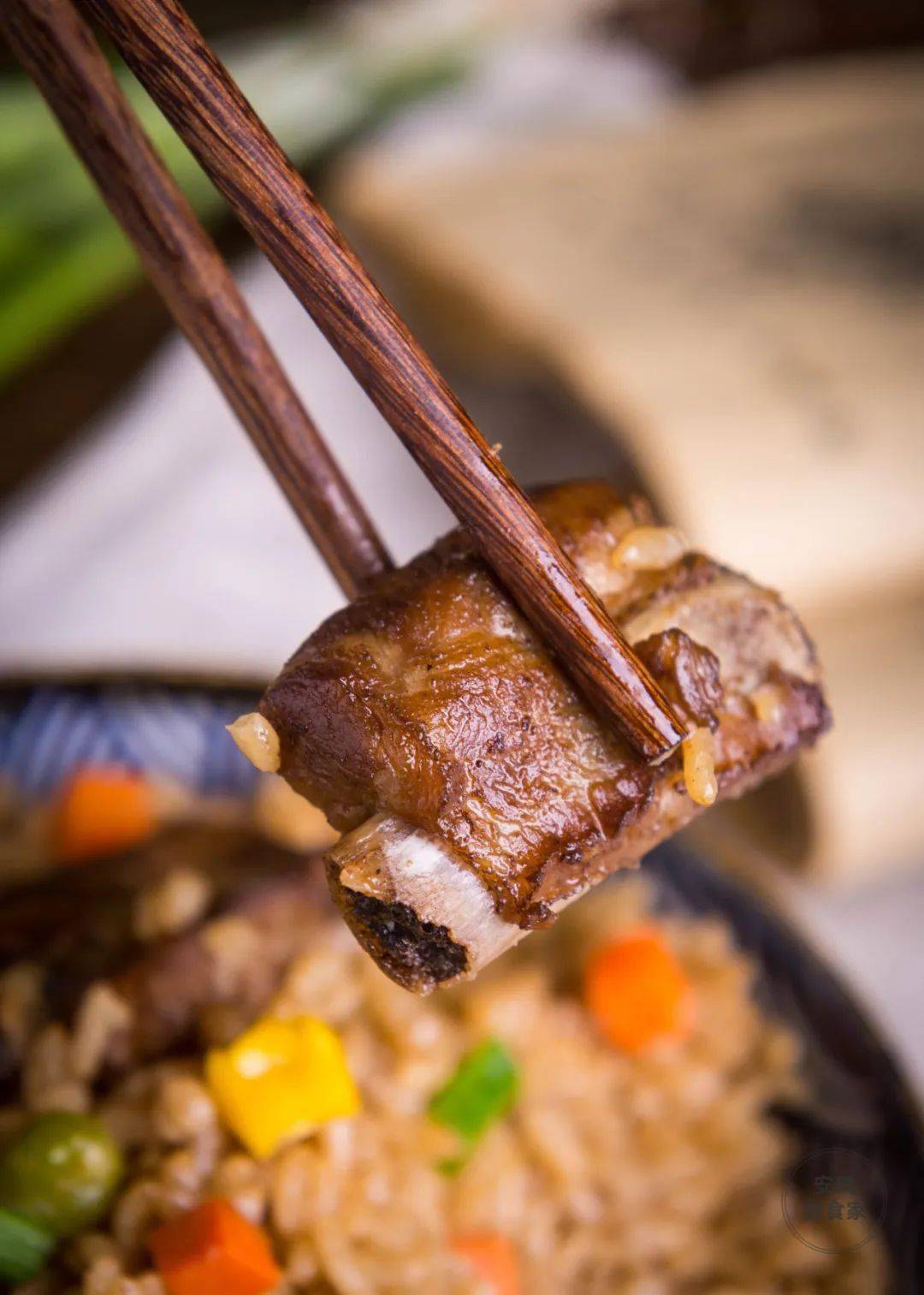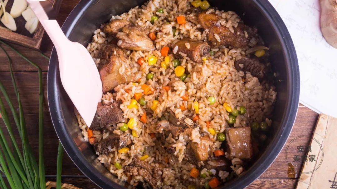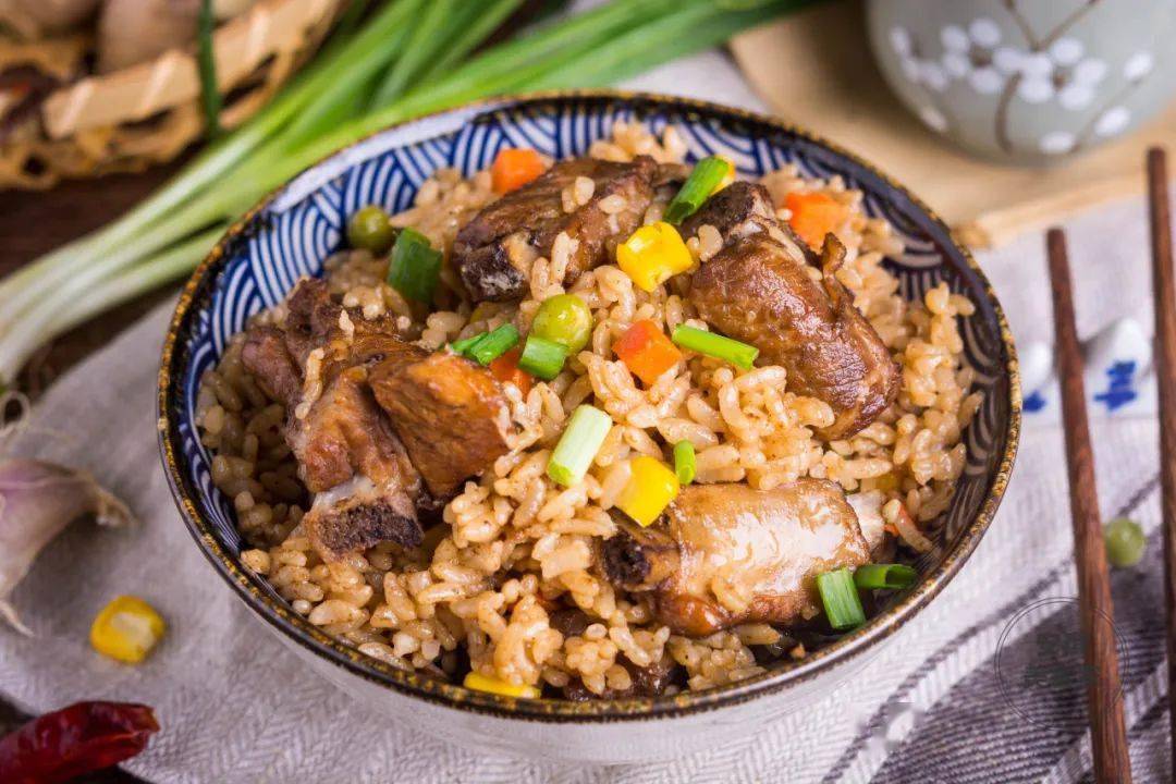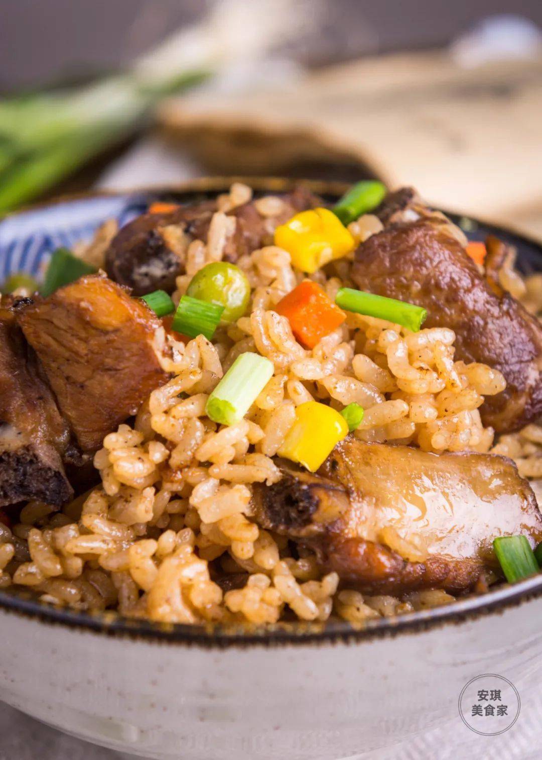 做好的排骨燜飯,排骨煮到軟爛,米飯粒粒分明,每一顆都吸收瞭湯汁,軟糯甜香,好吃到尖叫,絕對是燜飯中的王者!