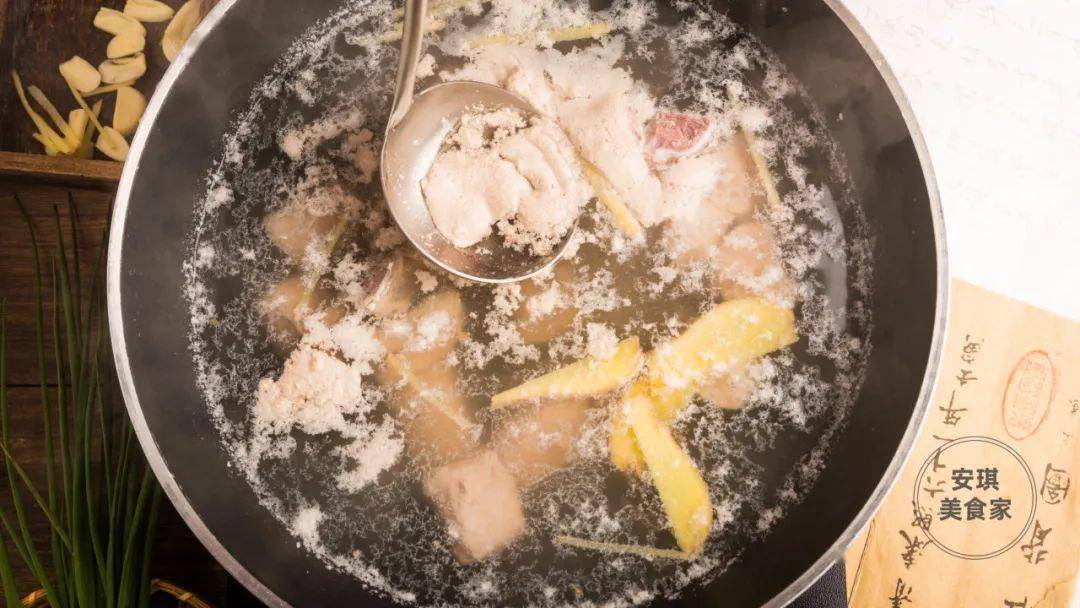 2、排骨洗凈,冷水下鍋,加入薑片和料酒,煮開,撈出瀝幹水分。