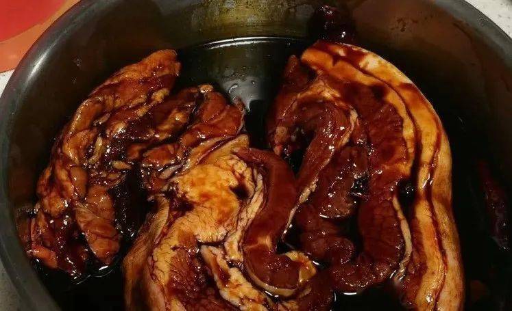 7、經過3天的浸泡,豬肉充分吸收瞭醬汁的味道和顏色,變成瞭紅褐色,有濃鬱的醬香味。