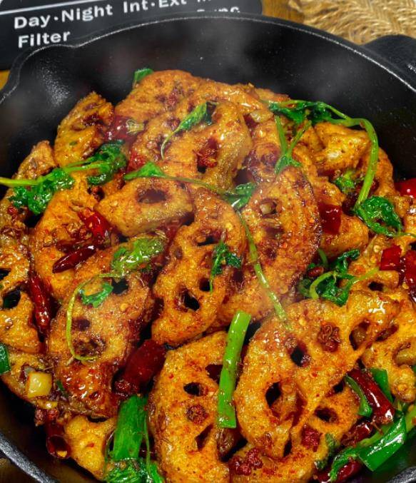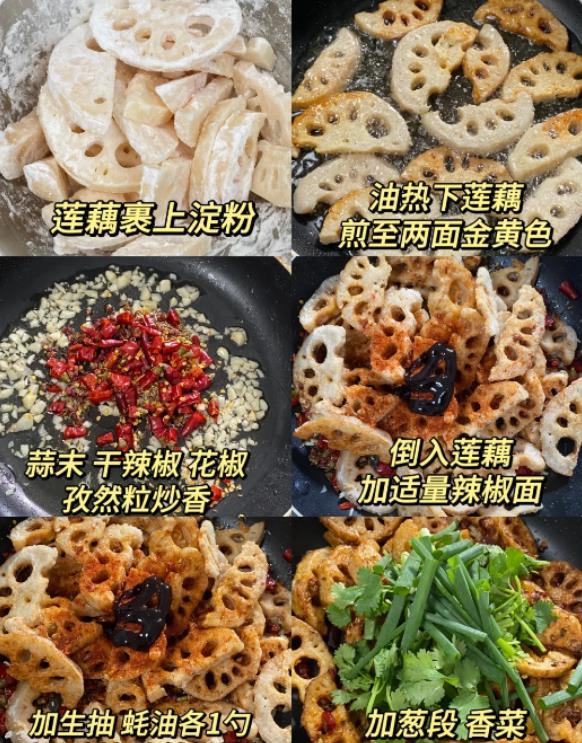 材料:蓮藕,幹辣椒,大蒜末,淀粉,花椒,孜然粒,辣椒面,生抽,蠔油,蔥段,香菜。