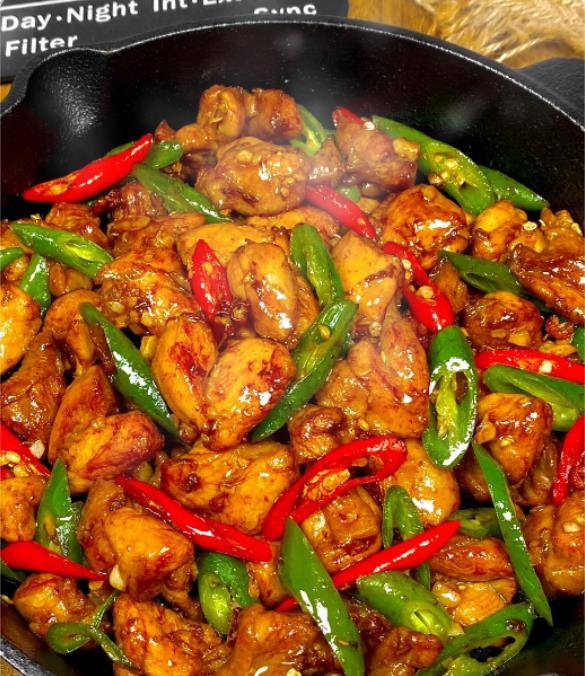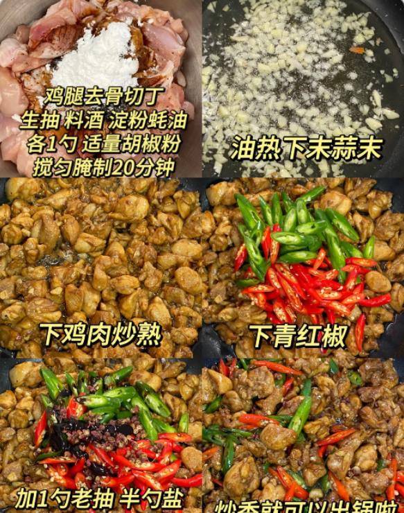 材料:雞腿,大蒜末,生薑末,老抽,花椒,青紅椒。