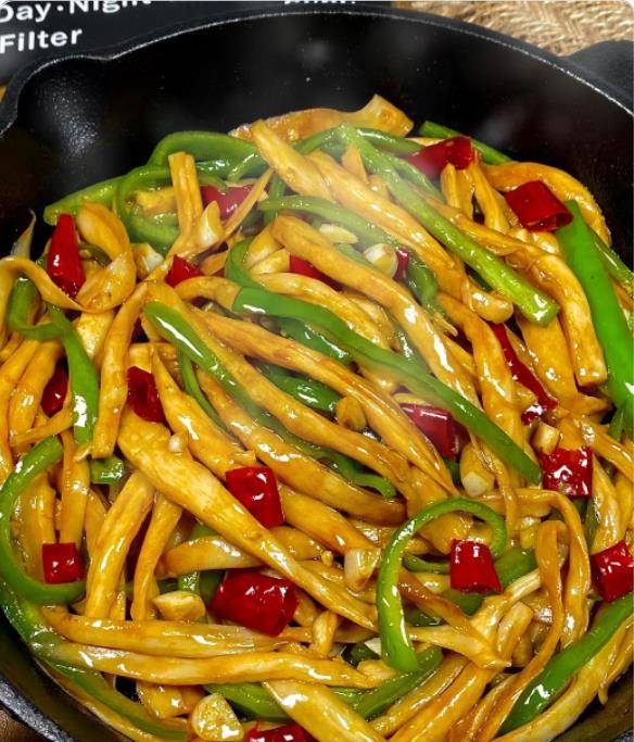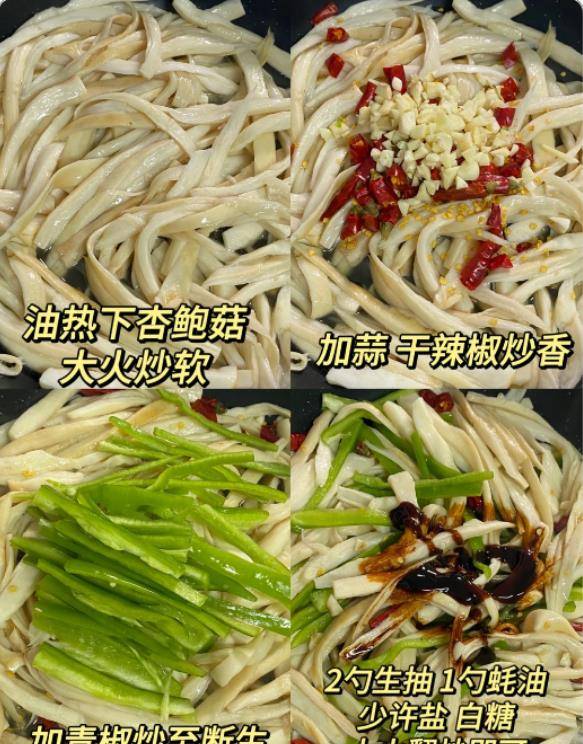 材料:杏鮑菇,青椒,大蒜,幹辣椒,生抽,蠔油,鹽,白糖。