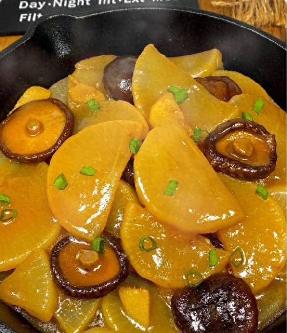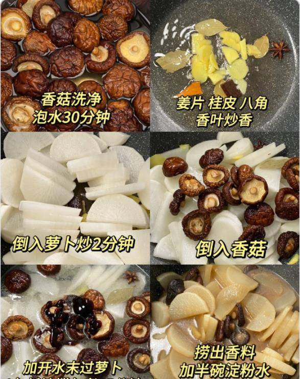 材料:白蘿卜,幹香菇,生薑片,桂皮,八角,香葉,蠔油。