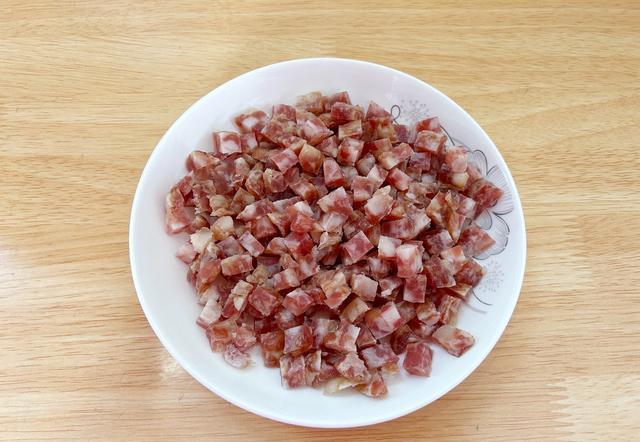 廣式臘腸切成玉米粒的大小的肉粒,我用瞭2根,大約是200克的重量。