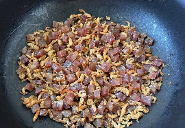 熱鍋放油,放入廣式臘腸翻炒出香味,加入小蝦仁翻炒均勻。