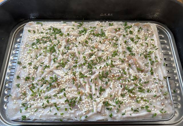 14分鐘後用筷子插到芋頭糕中,沒有生的面漿就說明蒸熟瞭。撒上白芝麻和蔥花再燜3分鐘。