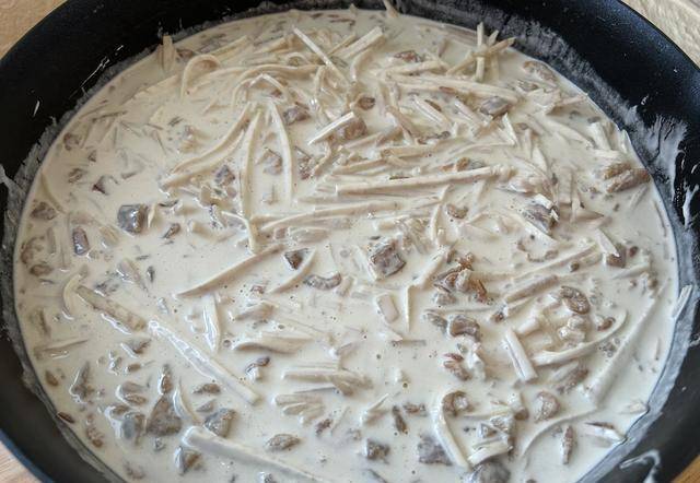 面漿倒入裝有香腸丁和芋頭絲的鍋裡,混合均勻,這個時候有半成品有一點濕是正常的。