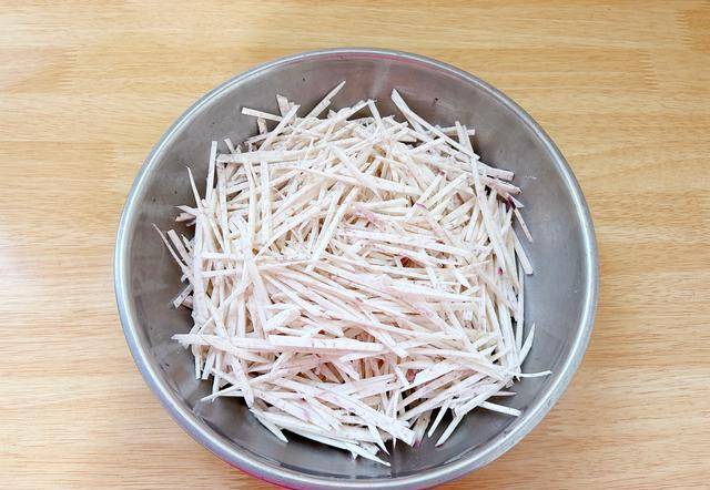 荔浦芋頭去皮,有坑窪的地方清理幹凈。先切成薄片再改刀切成絲,有刨絲工具的話會省事一些。
