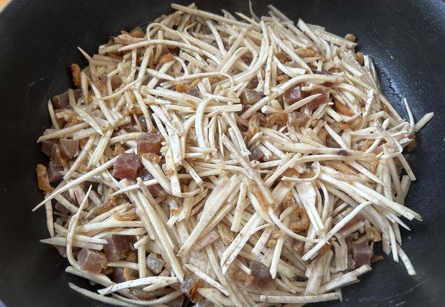 芋頭絲加入到臘腸丁和蝦仁中,中火加熱翻炒到有些變軟後關火,如果怕炒糊,可以加半碗水進去。