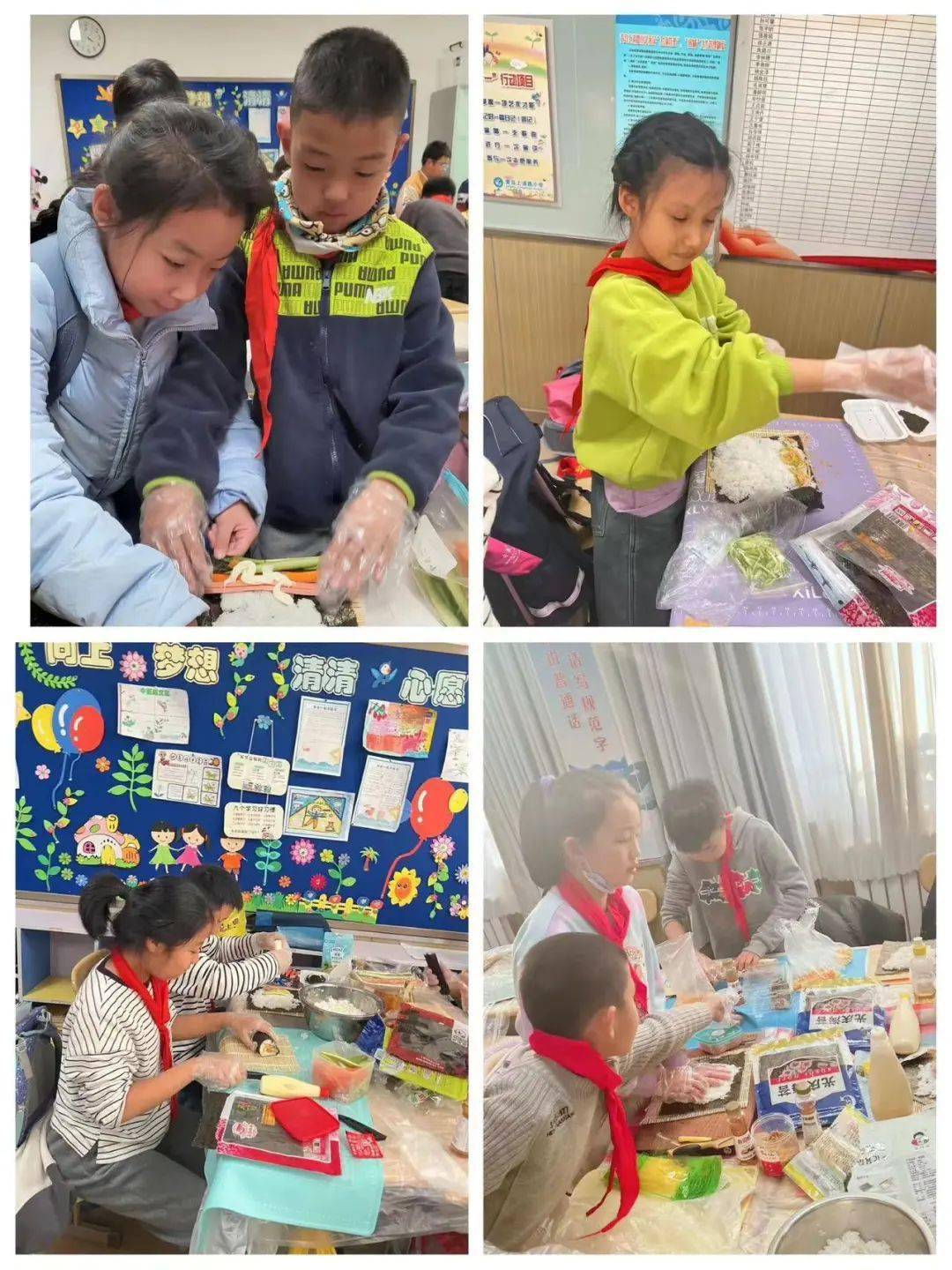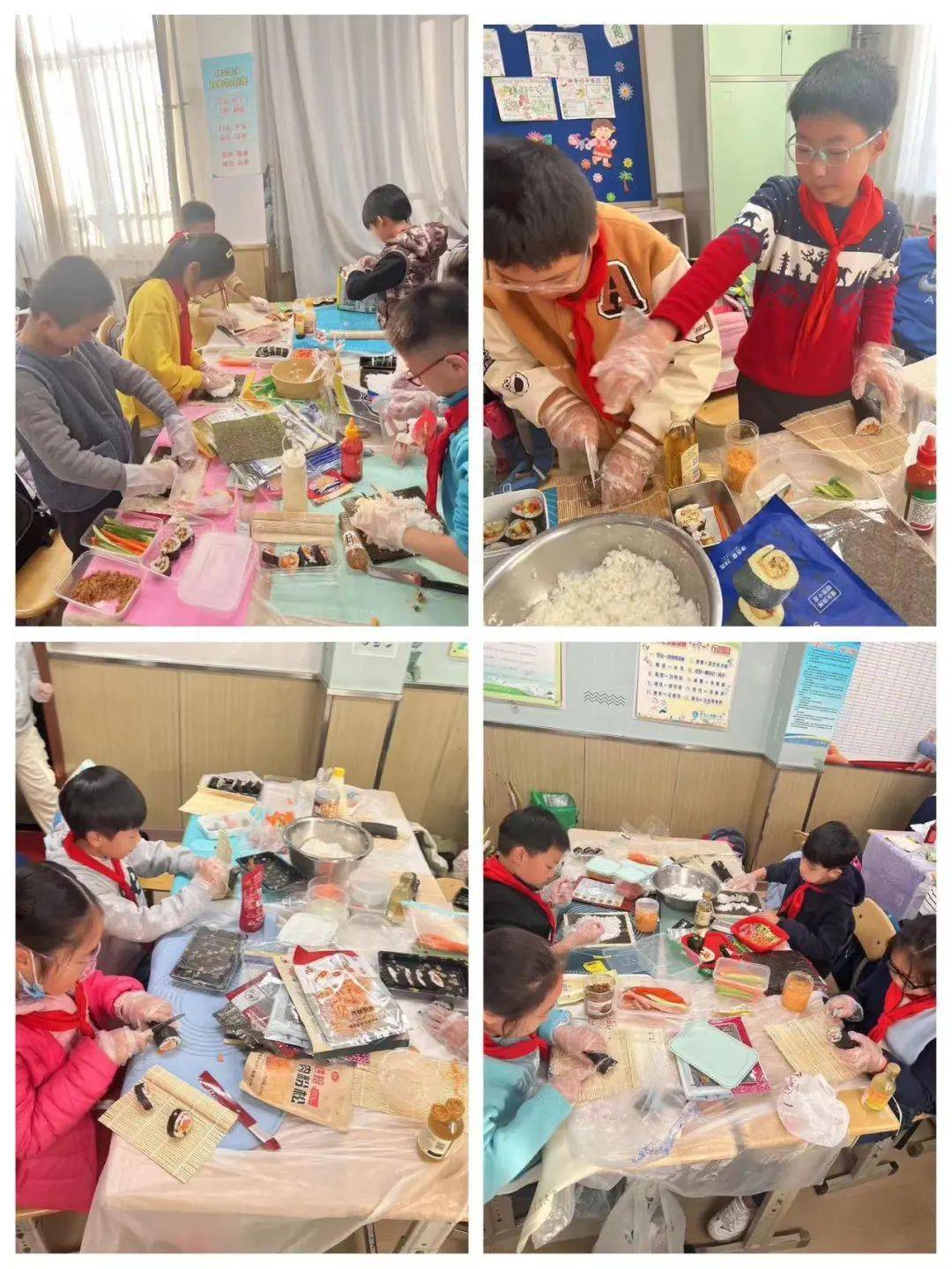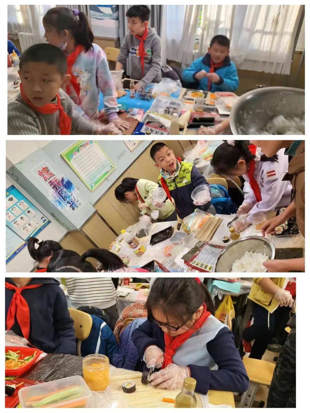 一個初冬的下午,四年級一班的課堂不同於往日的寧靜,顯得格外熱鬧。隊員們6人一組圍坐在一起,桌子上擺滿瞭各種食材,教室裡也傳來陣陣誘人的米飯香氣,大傢個個摩拳擦掌、躍躍欲試,一場沉浸式壽司制作體驗即將拉開帷幕。
