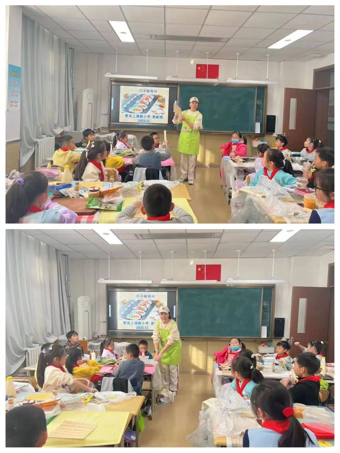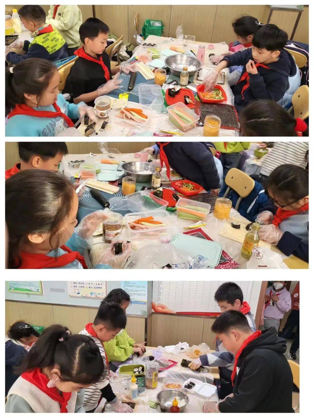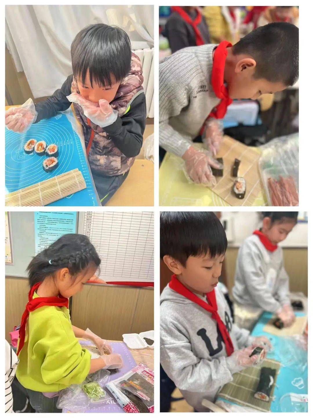 一個初冬的下午,四年級一班的課堂不同於往日的寧靜,顯得格外熱鬧。隊員們6人一組圍坐在一起,桌子上擺滿瞭各種食材,教室裡也傳來陣陣誘人的米飯香氣,大傢個個摩拳擦掌、躍躍欲試,一場沉浸式壽司制作體驗即將拉開帷幕。