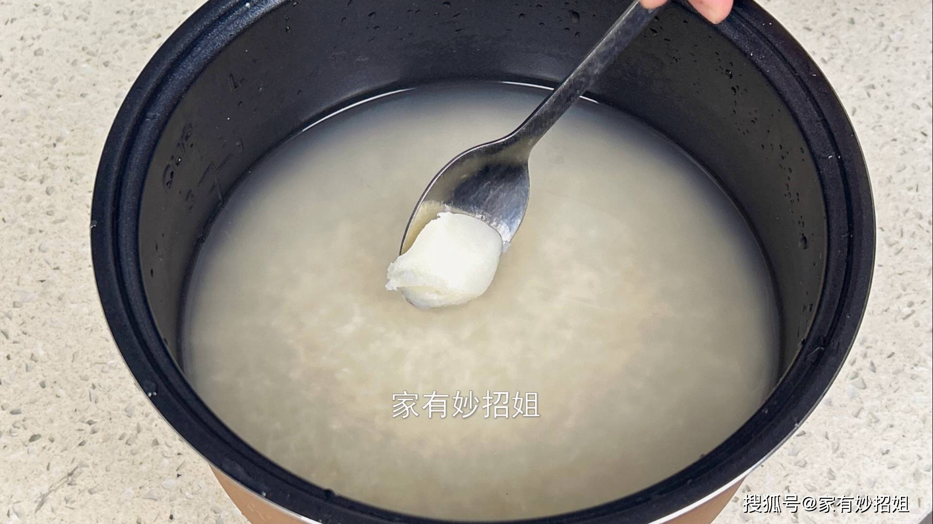 大米浸泡好,我們還需要往裡面加入一小勺的豬油。要是傢裡沒豬油的話,我們也可以倒入一點食用油,效果也是一樣的。加入瞭食油,煮出來的米飯就會變得更加香,而且還不會出現粘鍋的情況。