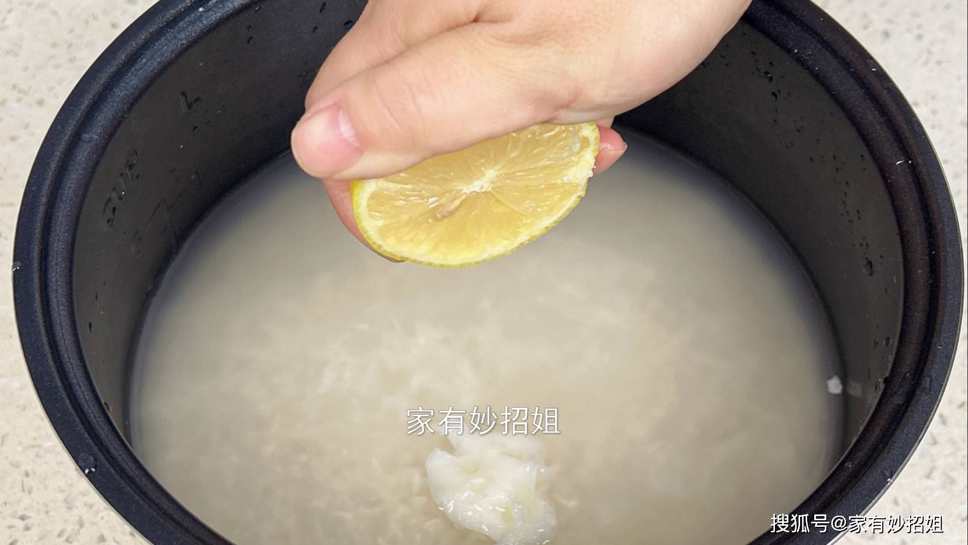接著,我們還需要往裡面擠入幾滴檸檬,傢裡沒有檸檬的,也可以倒入一小勺的白醋代替。雖然說檸檬和白醋都是酸的,但我們隻加入一點點,並不會使煮出的米飯有酸味,反而還會使米飯變得更加松軟好吃。