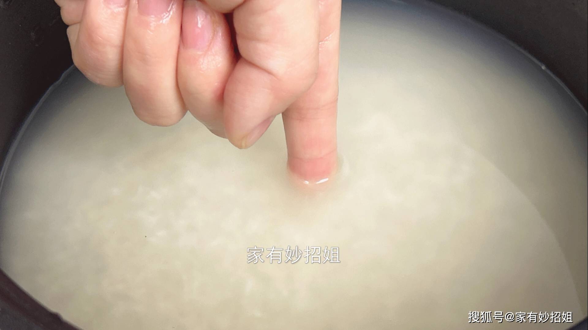 當大米淘洗好後,我們就需要加水瞭。可能很多朋友加水,就是憑感覺加的,但煮米飯的水如果加多瞭,米飯就會變稀,而水要是加少瞭,煮出來的米飯也會太硬不好吃,甚至還會出現夾生的情況,所以煮米飯加水可是個技術活。其實我們隻需要用手指測量一下,把食指放在米面上,水位隻要沒過半截食指的高度就差不多瞭。