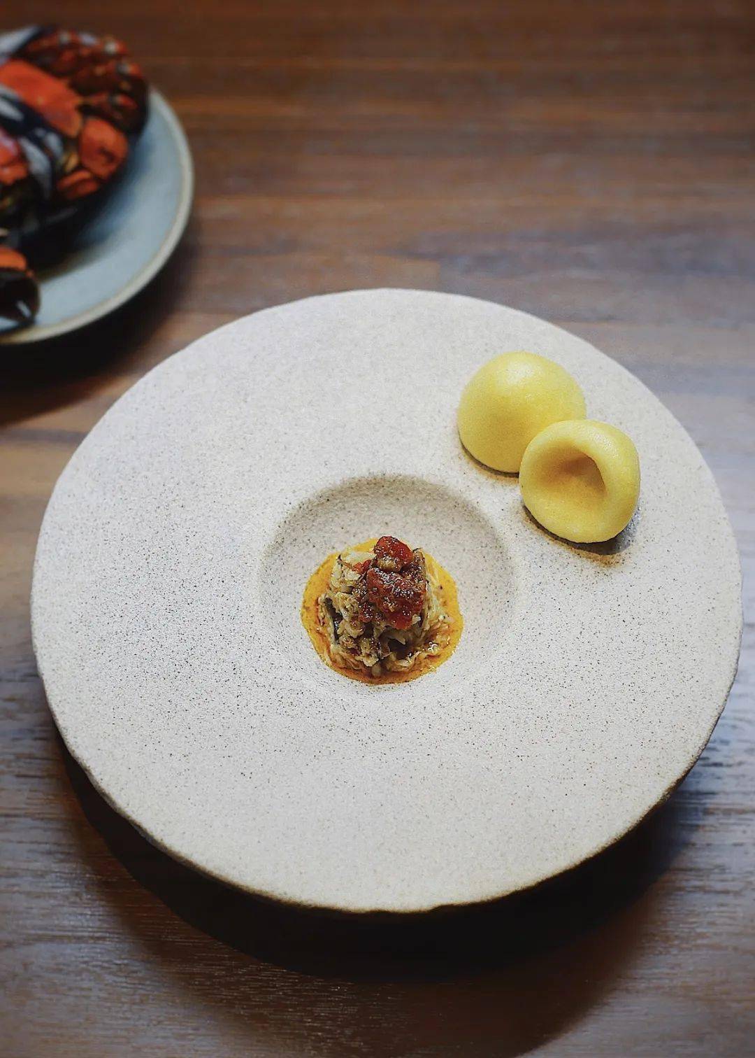 菊黃蟹肥秋正濃,Shane 從古代的酒糟蟹中獲取靈感,用江蘇泗洪的大閘蟹做手拆蟹肉,將傢鄉平湖特產「糟蛋」的酒糟與蟹殼吊的蟹湯,做成偏西式的醬汁調味,蟹黃的部分則做成瞭禿黃油。一整隻蟹被充分利用各部位,真正做到“物盡其用”。盤子邊上還另外搭配瞭兩個自制的迷你玉米窩窩頭,讓食客可以根據喜好將蟹肉填入其中,增加體驗感。