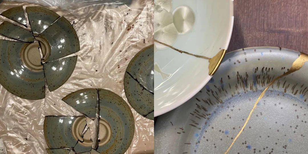 左:餐廳破損的盤子,右:以金繕技藝修復後的盤子