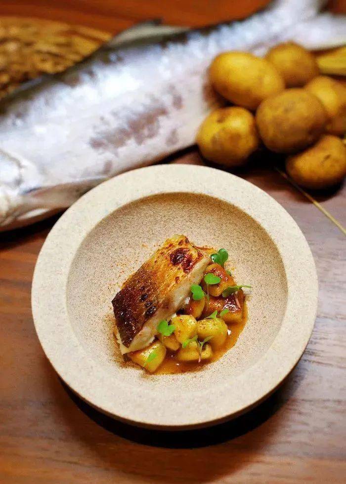Malik 與 Shane 兩人在菜品上也有各自擅長的領域,這道「馬友魚,土豆,黃酒」就由兩人分工完成。更擅長魚類與肉類烹制的 Malik 負責處理油脂豐腴的馬友魚,他將產自中國臺灣的馬友魚醋漬後一夜風幹,濃縮鮮味,再高溫碳烤,焦香酥脆的魚皮下藏著口感細膩的魚肉。Shane 負責配菜與醬汁的調味,她基於江浙菜中的黃魚年糕,以魚湯為基底,加入蔥、薑、蒜、醬油、黃酒等佐料調制出江浙口感的湯汁。並為馬友魚搭配瞭自制的小團子,蒸制後的糯米打成糍粑,混合土豆,口感介於紮實的年糕與松軟的意式 Gnocchi 之間,將湯汁的鮮味盡收其中。