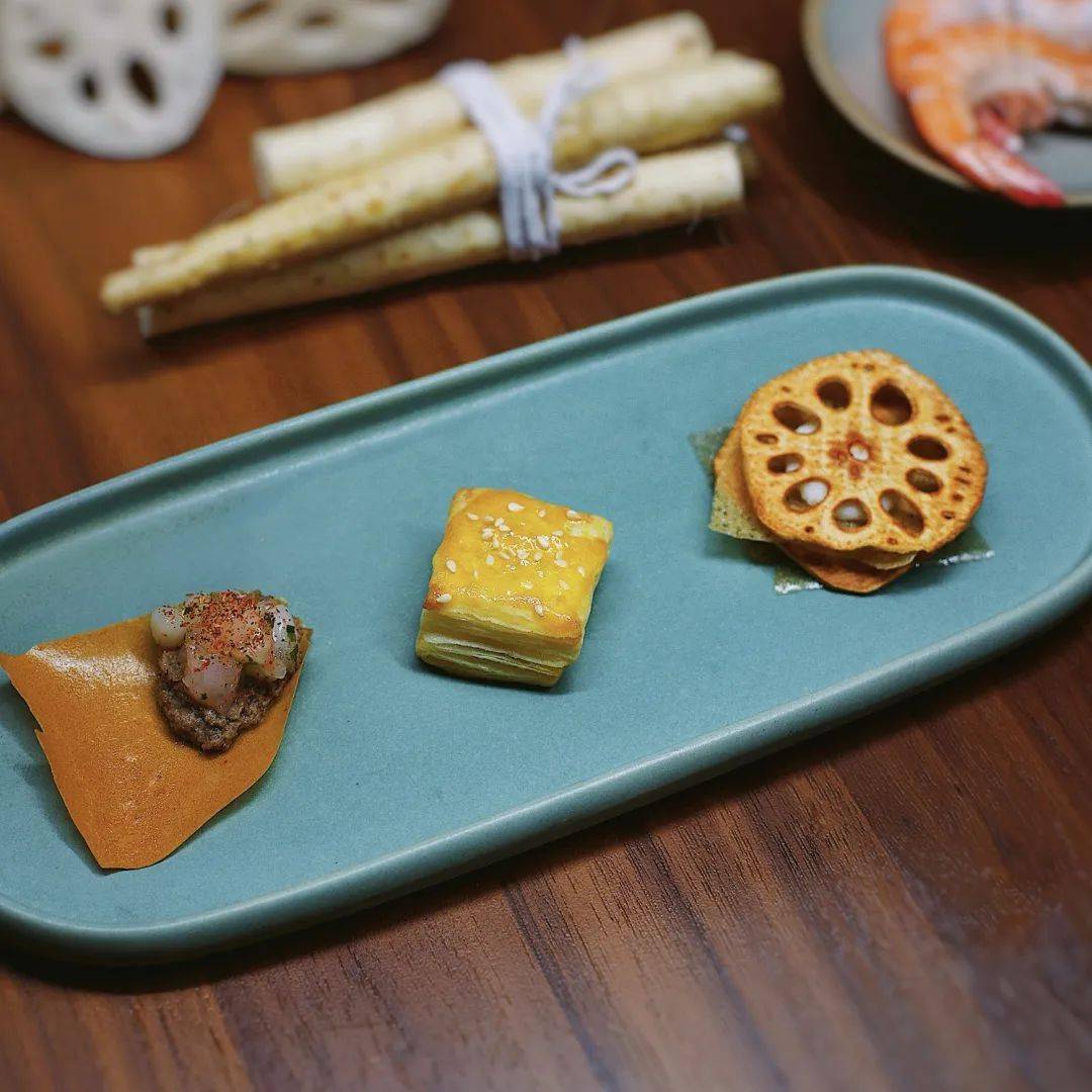 秋季菜單中的前菜,兩人通力合作打造瞭三道小食。「蝦,蝦,蝦」由 Malik 創作,選用浙江舟山的基圍蝦熬制濃湯後做成脆片,搭配甜蝦肉與香菇、金針菇、口蘑等多種食材做成的菌菇泥,頂部撒上甜蝦籽,小小一口便可以嘗到蝦的三種不同形態,層層壘起的鮮味在口中交織出和諧曼妙的組曲。Shane 以“鮮肉月餅”為靈感,手工開酥的外皮中加入瞭豬肉肉餡,雖是西式技法,但入口的滋味卻是熟悉的上海味道。還有一道小食,Shane 將杭州的藕與山藥烘幹後膨化,做成脆片,層疊交錯,中間用馬蘇裡拉奶酪與鐵棍山藥做白色夾心,創意十足。