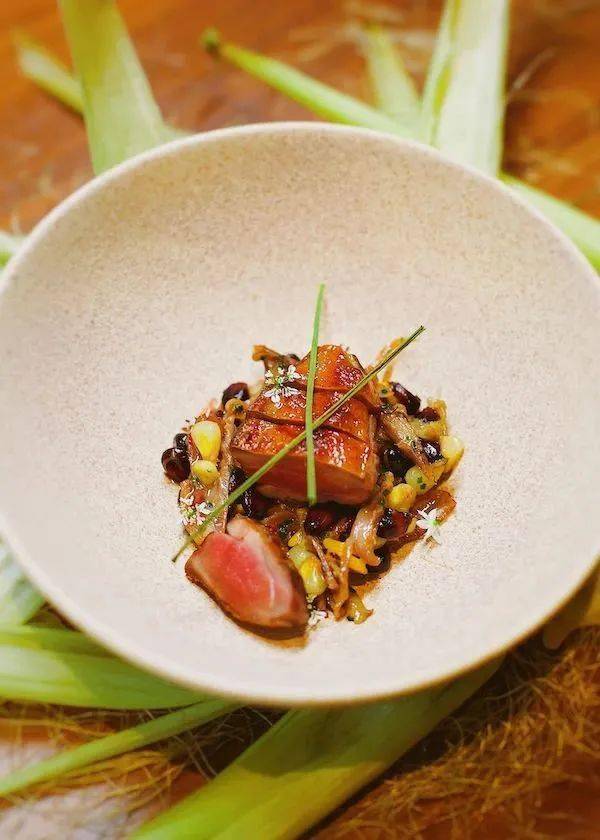 上海崇明的鴿子是餐廳的常駐食材之一,秋季菜單中 Malik 搭配瞭玉米。他取厚實無骨的鴿胸部位,風幹熟成後碳烤,鴿肉表面微焦,內部柔軟、色澤粉嫩。再淋上南乳醬汁,發酵的香氣與鴿子的油脂相互融合,入口能嘗到淡淡的酒糟味與甜味。底部用鴿子的其他部位以油封的形式,燉甜玉米、糯玉米、紫玉米,牢牢鎖住秋收的甜美滋味。