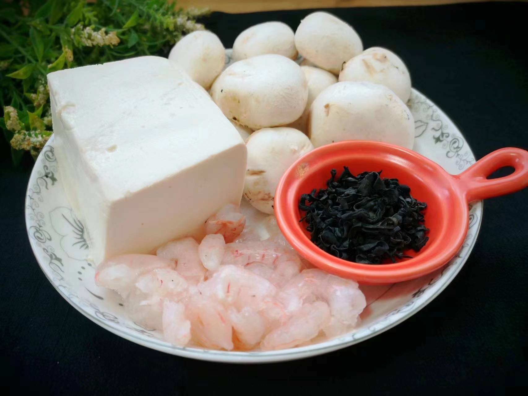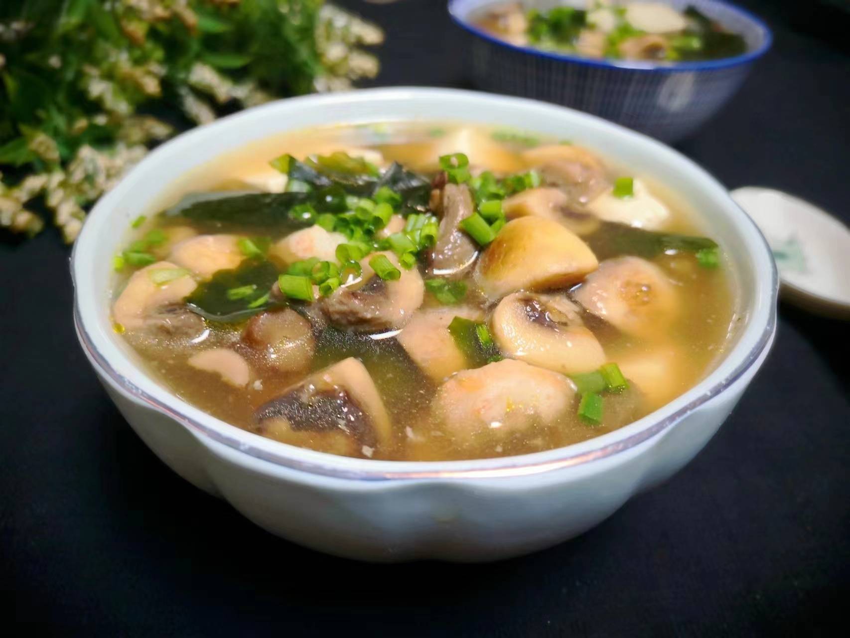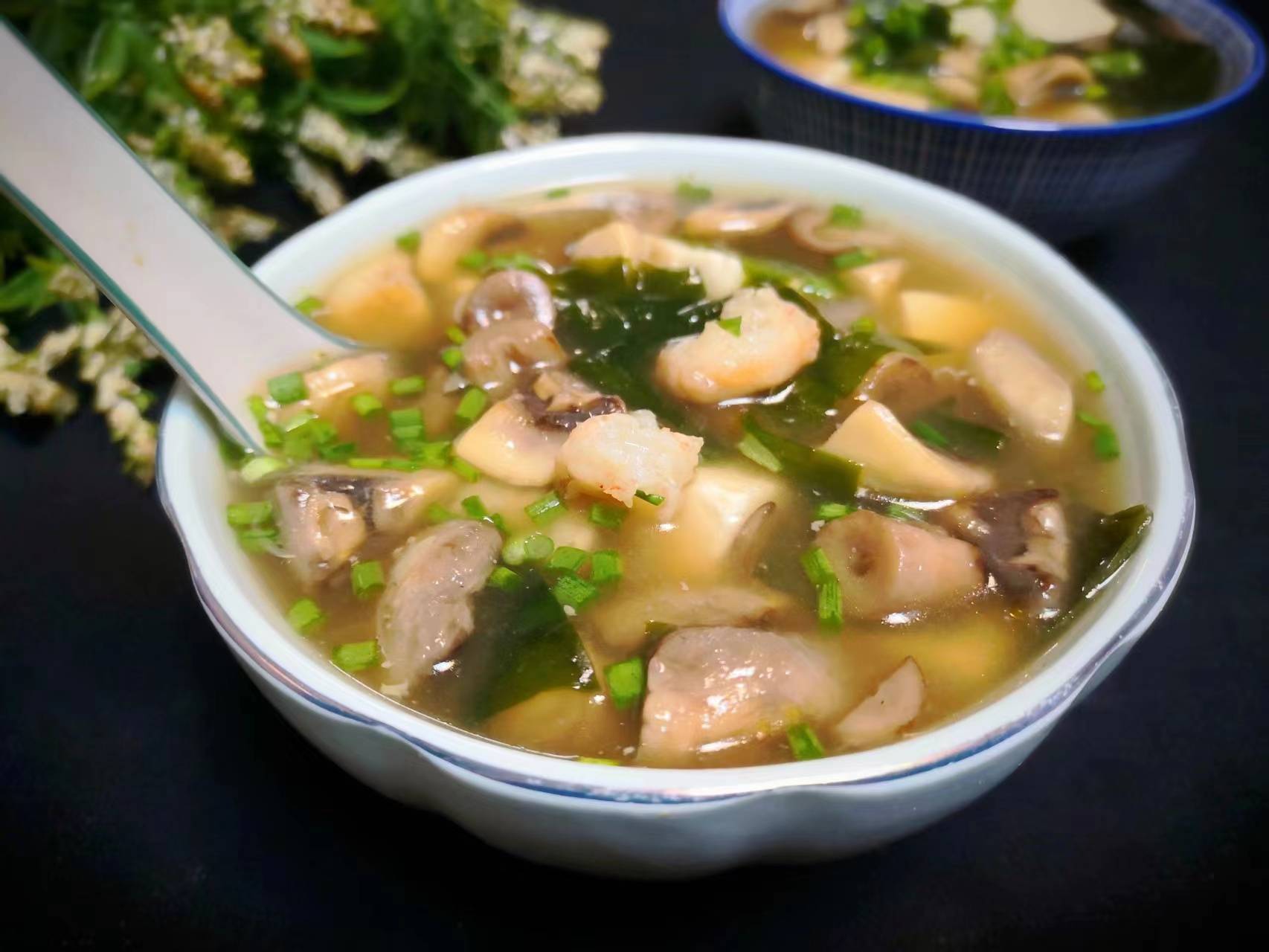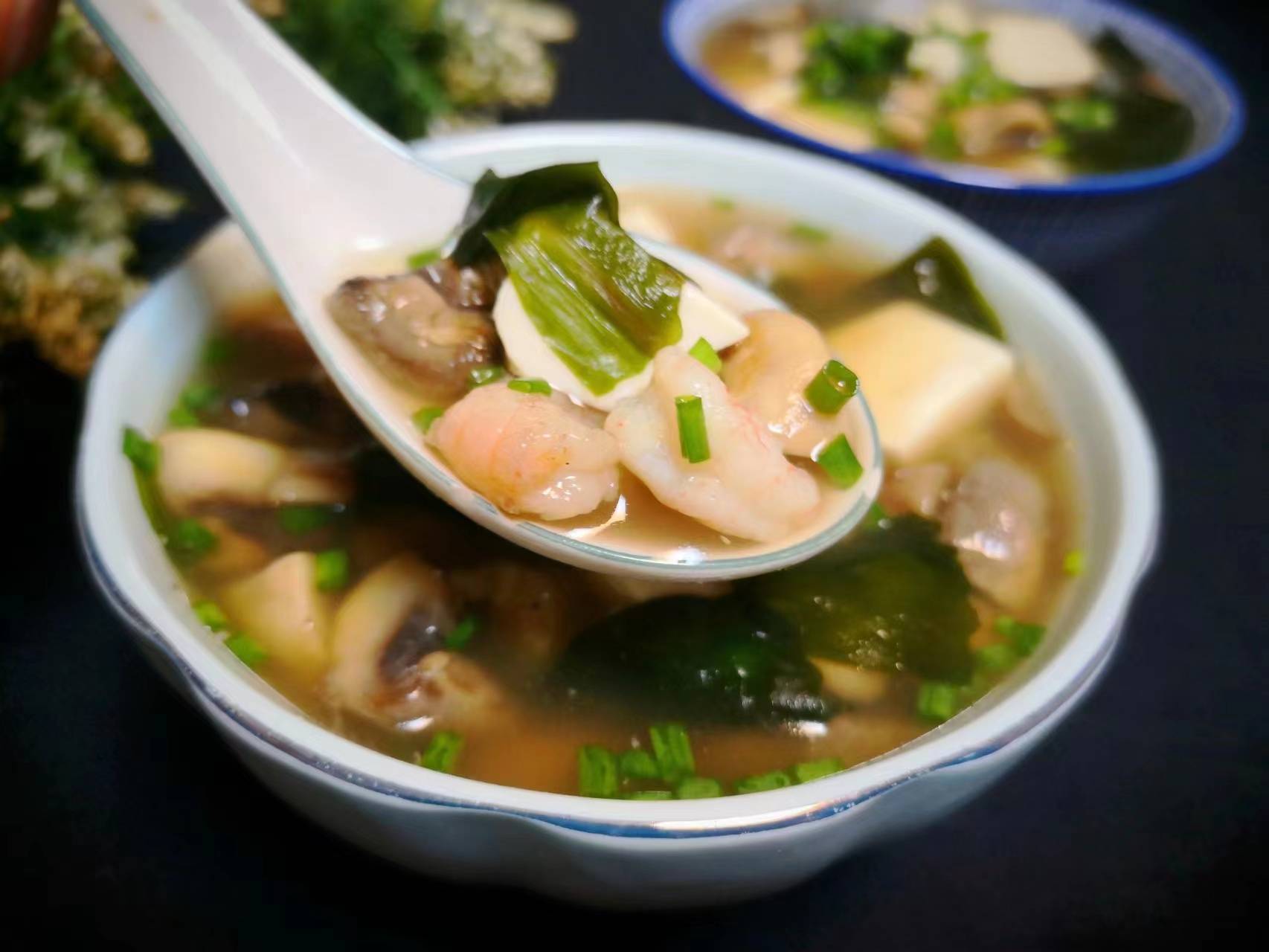食材:口蘑、豆腐、蝦仁、裙帶菜、鹽、雞精、生抽、胡椒粉、香油。