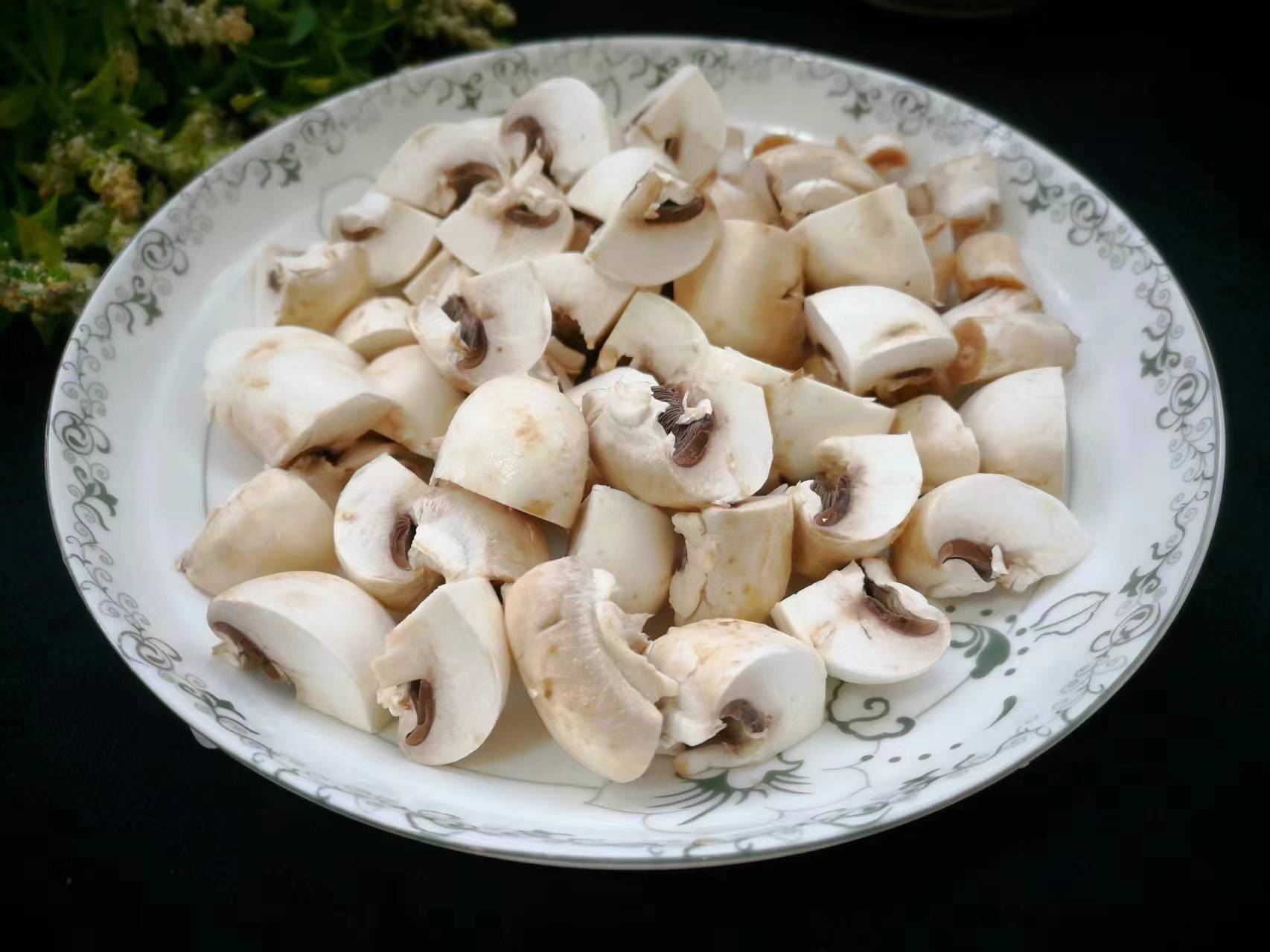 2、口蘑買回來後先用清水清洗一遍,然後再放入大碗內,加入適量的清水,再加入一勺食用鹽,用筷子把食用鹽攪散溶化,把口蘑浸泡10分鐘,浸泡好後再清洗一遍,瀝幹表面的水分,把它切成小塊。