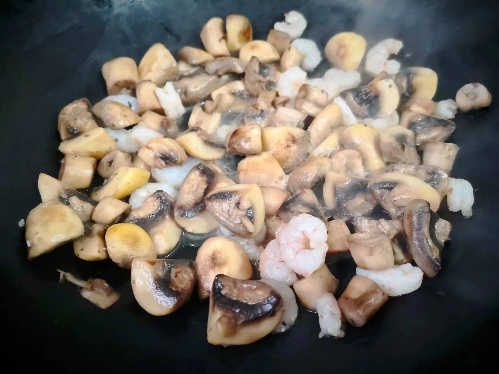 5、 鍋中加入少許食用油,油熱後加入口翻炒片刻再下入和蝦人,翻炒一會兒,炒至蝦仁的顏色變紅。