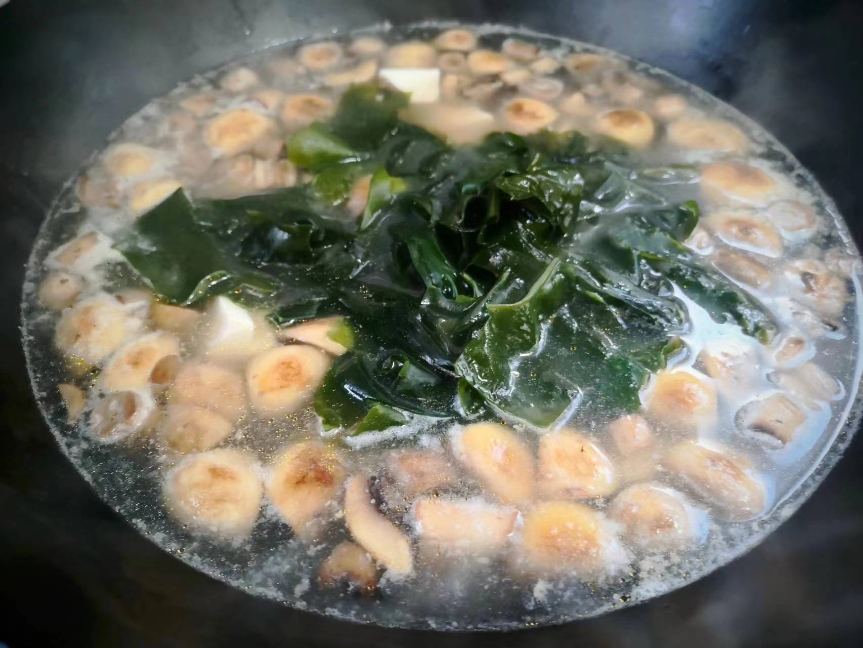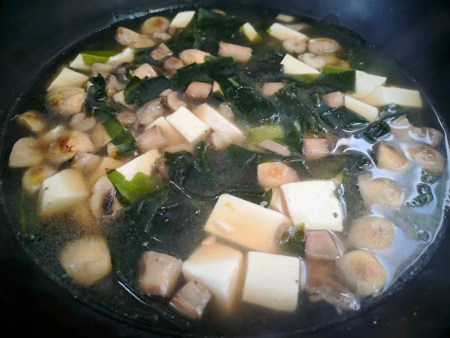 6、 加入適量清水,蓋上鍋蓋,大火煮至沸騰,再小火煮兩分鐘,再將豆腐和裙帶菜下進去。