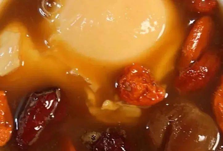 2、時間到,打入雞蛋煮至定型,再放入酒釀和紅糖煮三分鐘。最後撒上枸杞子即可出鍋開吃。