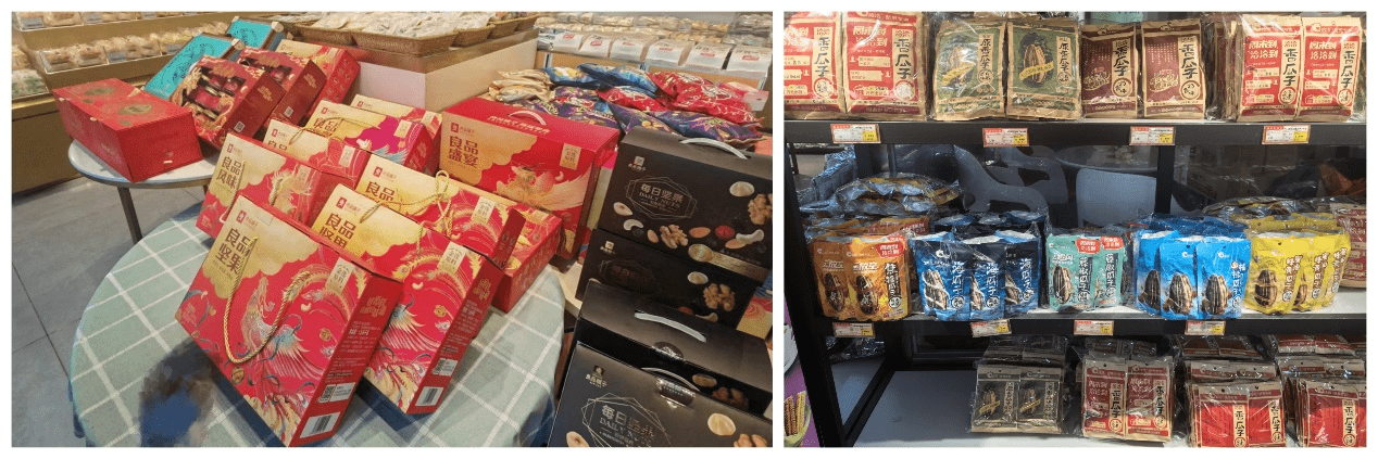 (批發商店內的良品鋪子禮盒、恰恰瓜子系列 圖片來源:財聯社記者攝)