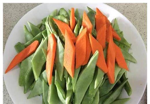 第二步:先把豆子去掉,把筋去掉。拔完所有的豆子後,將豆子清洗幹凈,放在切菜板上。然後將豆子切成斜片或切段備用。我們傢裡有一些胡蘿卜,所以我把胡蘿卜洗幹凈,把根切掉,然後切成斜片放在一邊。最後,將蔥切片,薑切片備用。