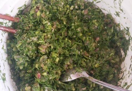 第二步是在過程中準備餡料。準備一把茴香,摘洗幹凈,擦幹水分,然後將茴香切成小塊,加少許鹽,用手調勻,靜置。醃制一會兒;