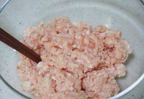 第三步,將豬肉餡切碎,放入碗中。加入蔥、薑、生抽、蠔油、料酒、胡椒粉和少許食用油。朝一個方向攪拌均勻,直至濃稠。讓它醃制。 20分鐘;