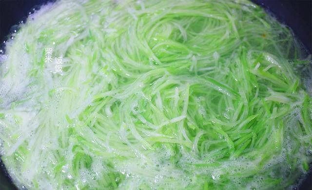 1,蘿卜去皮洗凈,用擦絲器擦成細絲。水開下鍋,大火焯燙2分鐘撈出。