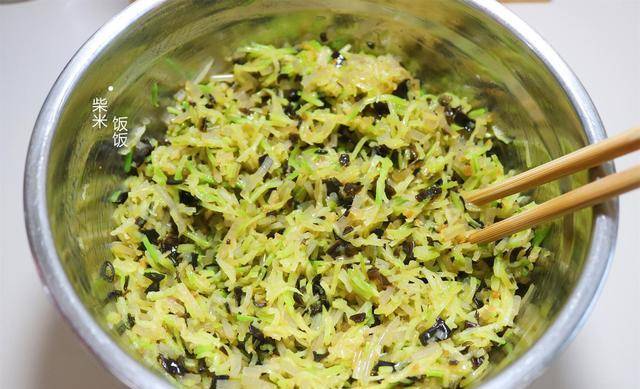 2,用涼水將蘿卜絲淘涼,再攥幹水分,然後切碎。