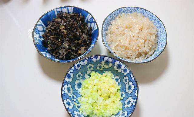 3,粉條和木耳提前用溫水泡飯,洗凈後切碎。再準備一些蔥末和薑末。