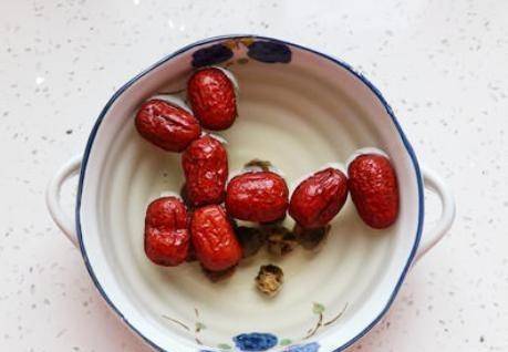 第三步,用筷子攪拌均勻,直至形成球狀。用一塊保鮮膜蓋住它,讓它發酵1小時。這個過程中,將紅棗用水浸泡一會兒,洗凈,去掉籽;