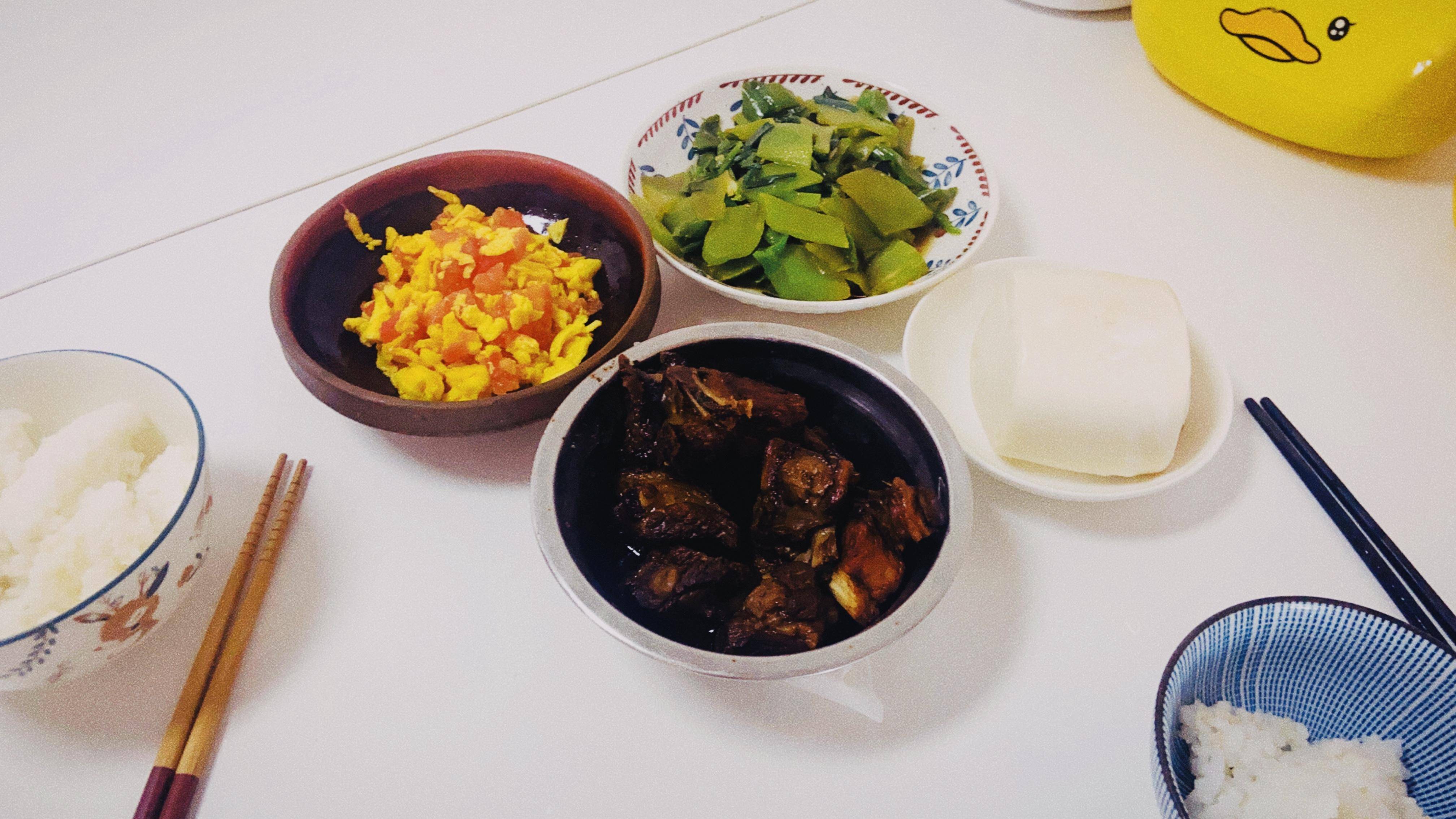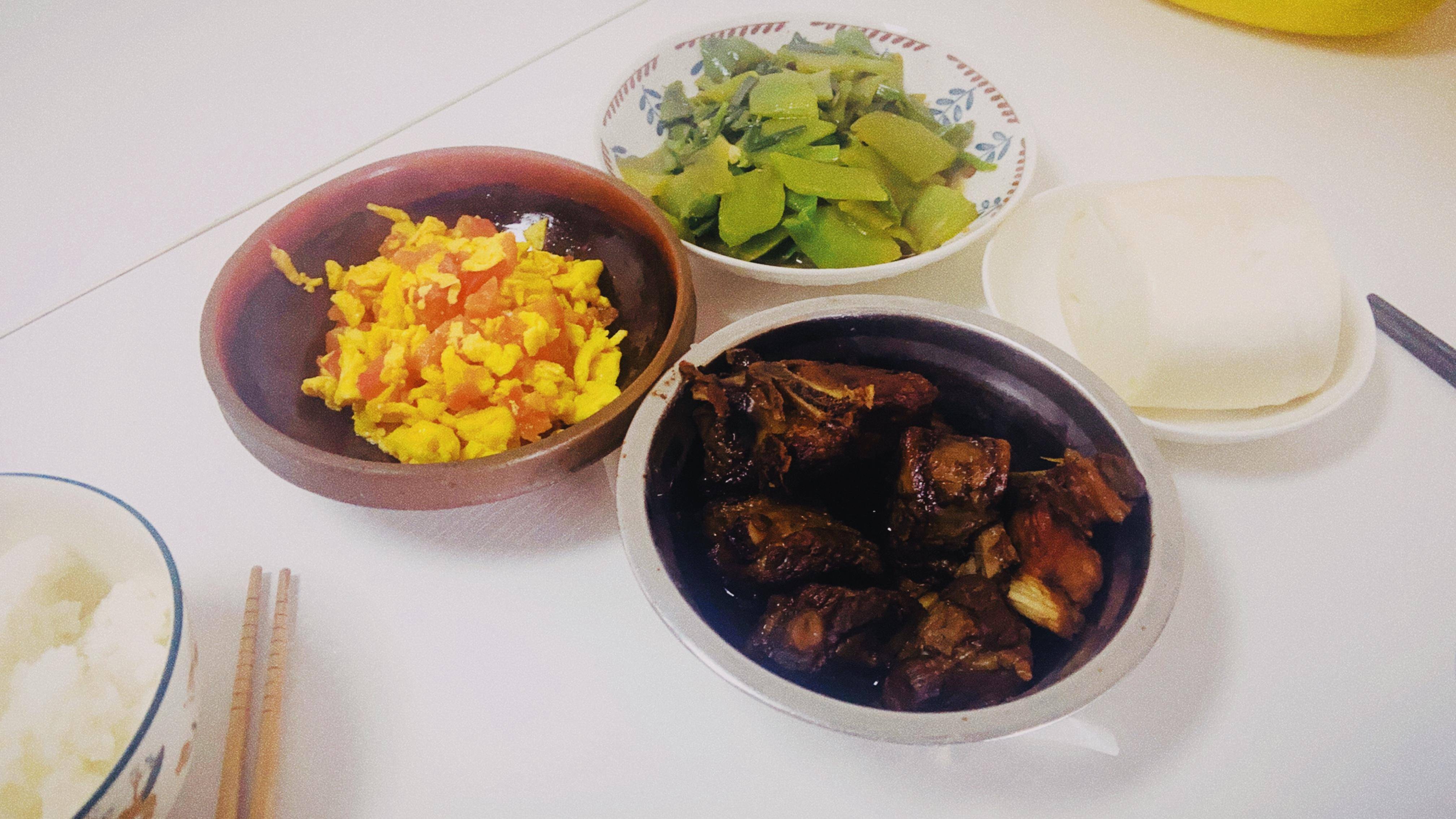還一點排骨,紅燒的,蒸瞭一個饅頭,本來準備自己吃,因為最近我也不太想吃米飯,結果孩子說她想吃,算瞭給她吃吧,她用西紅柿炒雞蛋當配料吃瞭一整個饅頭還有半碗米飯。